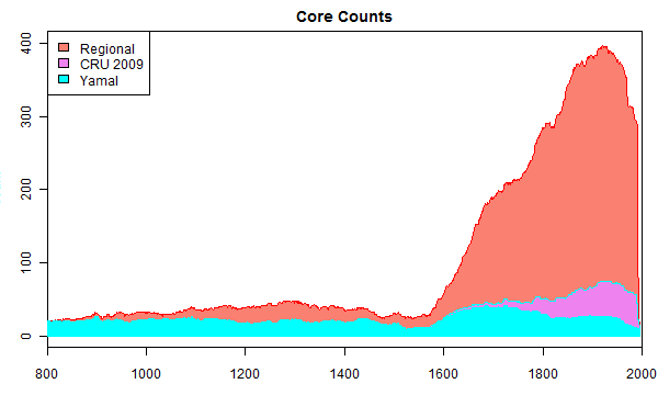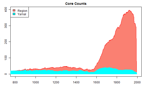 The figure below compares core counts for the withheld regional chronology (salmon) to core counts for Yamal (cyan). Modern core counts for the regional chronology are about 20 times higher than core counts in the reported Yamal chronology, reaching nearly 400 cores in the 1960s. In the 1980s, core counts are still around 300, as compared to 12 in the Yamal chronology.