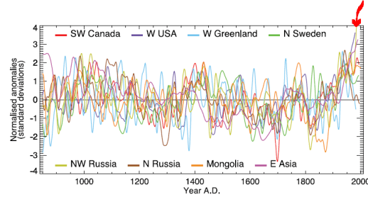 That sort of thing though would need to be explained. Either it would mean that trees all-of-a-sudden ceased to be a good proxy for temperature after a certain point (atmospheric CO2 level?) whereas before it was still ‘good’, or it would mean that perhaps trees themselves aren’t a good proxy for temperature.