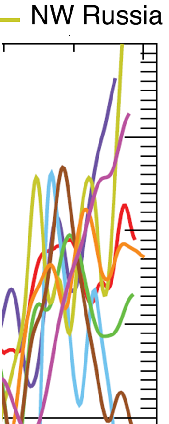 When we later received a request to submit a paper to a planned themed issue of the Philosophical Transactions of the Royal Society about ‘The boreal forest and global change’, Briffa and colleagues decided to use some of the material to hand in preparing a draft. It was intended that this should describe 3 continuous 2000-year ring-width series, each originally planned to represent the integration of a large-regional data set of subfossil and living tree data. The focus was to be on representing large-regional growth signals and initial comparisons with equivalent regional temperature data. The western, ‘Fennoscandia’, series would incorporate near tree-line pine data from northern Sweden and Finland; the Avam-Taimyr series would integrate larch data from near the Taimyr peninsula tree-line region. Between these we had intended to explore an integrated Polar Urals/Yamal larch series but it was felt that this work could not be completed in time and Briffa made the decision to reprocess the Yamal ring-width data to hand, using improved standardization techniques, and include this series in the submitted paper.