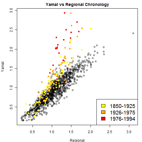 Although this chronology seems to look a lot different than the canonical Yamal hockey stick, prior to the 20th century, they are extremely similar (800-1900 correlation of 0.91.) Briffa’s Yamal chronology diverges high in the 20th century and especially the late 20th century, as shown in both figures below. In the left figure, both series are scaled on 800-1900 to emphasize the 20th century high divergence of the Briffa Yamal chronology; on the right is a scatter plot of Briffa’s Yamal (800-1996) against the regional chronology, with values after 1850 colored, also showing the high divergence.