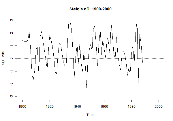 loc="http://faculty.washington.edu/steig/sipledome/SipleDomeCores_AB.txt" download.file(loc,"temp") work=read.table("temp",skip=3,header=TRUE) names(work)=c("year","dD","O18") work[work==999999]=NA steig=work trim=function(x) window(x, start= min(time(x)[!is.na(x)]),end=max(time(x)[!is.na(x)]) ) dD=trim(ts(rev(steig$dD),start=995)) x=window(ts(scale(dD), start=tsp(dD)[1]),1880) #png(file="d:/climate/images/2012/proxy/siple_dD_20cent.png",h=420,w=600) plot(x,ylab="SD Units" ,xlim=c(1880,2000),ylim=c(-3,3)) title("Steig's dD: 20th Century") abline(h=0,lty=3) #dev.off()Are there any other ways to filter, scale, adjust, etc. this data so that a graph of it shows what Gavin was talking about? I suspect he wouldn’t have made his statement up out of thin air, os perhaps his graph looks different somehow?
