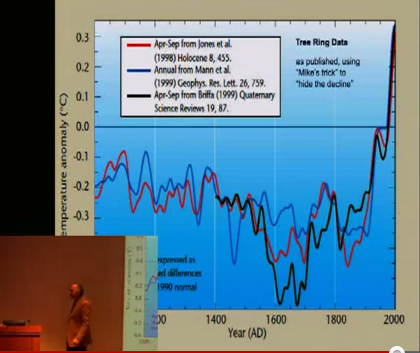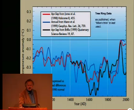 Neither of these phrases really captures my position. In respect to a signature issue – deleting data to hide the decline, I had spotted hide-the-decline in the IPCC graphic some years ago. As a reviewer, I asked that the practice be discontinued in AR4 but was blown off. What was new in the Climategate emails was that it showed that hide-the-decline in IPCC TAR was done in direct response to a message from IPCC higher-ups that they wanted a proxy diagram for the SPM but didn’t want to “dilute the message” and Mann’s concern not to “give fodder to skeptics”. This is something that stock brokers, lawyers and fund managers understand. The failure of the climate community to be offended by such conduct amazes me, and, in my opinion, was a mistake for “your” side.