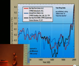 Figure 2. Muller in front of WMO hockey stick – a 1000 year reconstruction. Left – Hide the Decline; right – actual data.