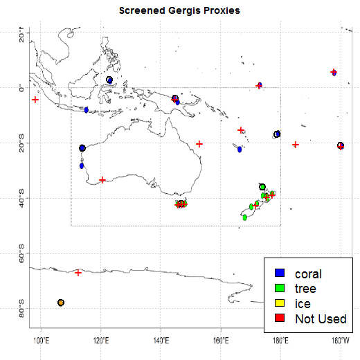 Figure 2. Gergis Location Map annoted to show unused proxies and “significant” proxies.