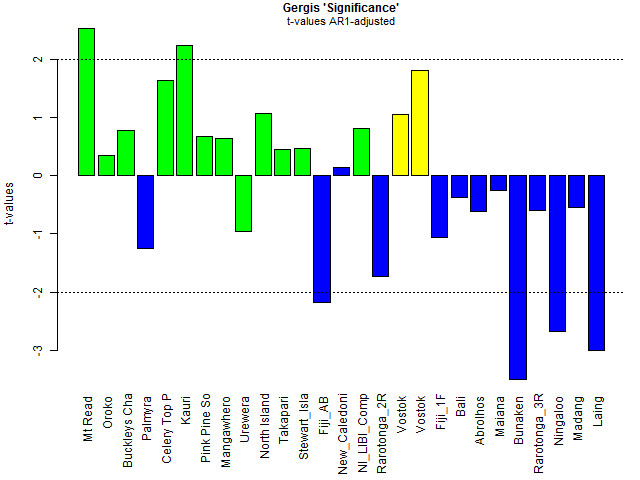 Some of the Quenouille-adjusted t-values in your 12:23 post are relatively small. E.g. New Caledonia (#14) at -0.98. Can you provide the p=0.05 thresholds as well, for the statistically-impaired (such as myself)? Gergis apparently used a two-sided test, but a one-sided test would seem to be more appropriate; I’d be interested in both threshold values if it’s not too difficult to produce.