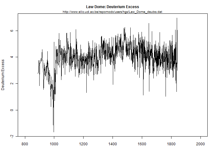 Update June 13: Deuterium excess data for Law Dome from 890-1841 was archived at Hugues Goosse’s this morning (http://www.elic.ucl.ac.be/repomodx/users/hgs/Law_Dome_deutxs.dat). Here’s what it looked like. The shift around AD1000 in this series is quite pronounced. The Goosse et al 2004 graphic cuts off at AD1000; looking closely it shows a downspike at the start, but it’s a much more prominent feature in the version shown below.