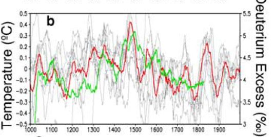 Original caption to Goosse et al Figure 3. …(b) [Annual mean temperature averaged over the the region 45–60S, 90–130E in an ensemble of 10 simulations (grey) and their mean (red)] and the deuterium excess measured in the Law Dome ice core, 67S–113E (green curve, left vertical axes).