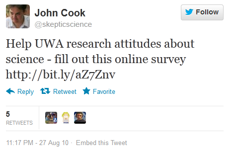 skepticscience Help UWA research attitudes about science – fill out this online survey http://bit.ly/aZ7Znv 6:17 AM Aug 28th, 2010 from web
