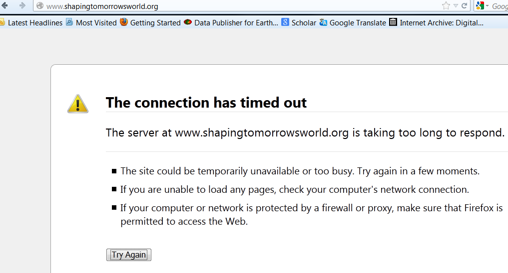 “The server at http://www.shapingtomorrowsworld.org is taking too long to respond.”