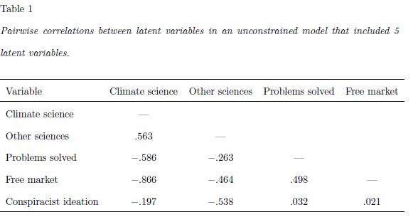 As noted above, the five “latent variables” are closely related to (lightly weighted) averages of agreement with propositions in five areas (conspiracy, free market economics, environmental solved so far, climate “science” and other science.