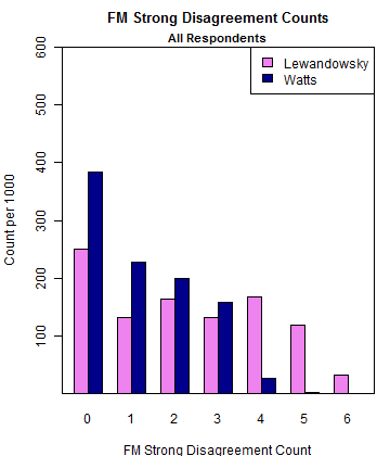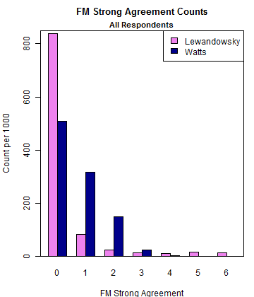 The next graphic shows something against this “expected” pattern. It shows the count (per 1000) of strong agreements with the FM propositions in the two surveys. Unsurprisingly, the count of respondents who did not strongly agree with any of the FM propositions (the zero count on the left) was larger in the survey at the anti-skeptic blogs than at WUWT. However, take a look at the right hand tail: this is the important feature. Zero WUWT respondents strongly agreed with 5 or more FM propositions, whereas 35 Lewandowsky respondents purported to strongly agree with 5 or more (with a further disproportionate Lewandowsky respondents purporting to believe in 4 or more.) In my opinion, all these 48 Lewandowsky responses are fake.