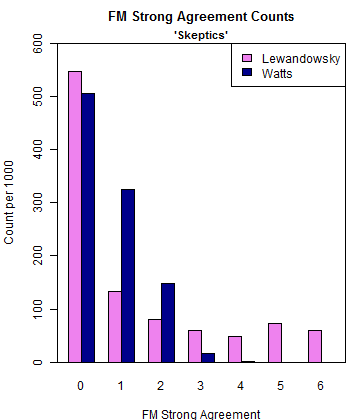 The discrepancy becomes even more pronounced when expressed in terms of the “skeptic” population in each survey as shown below. The incidence of ‘skeptics’ purporting to strongly agree with 5 or more FM propositions is 133 per 1000 in the Lewandowsky population, but zero in the WUWT population.