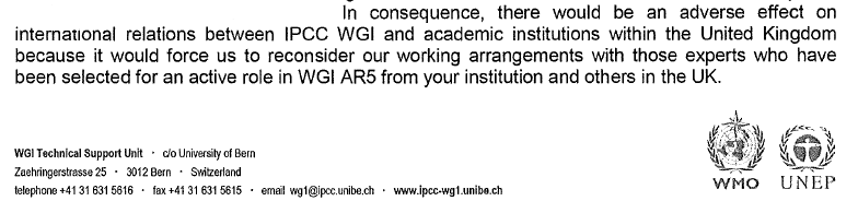 On several occasions, the co-chairs of IPCC Working Group I issued threats to institutions in the United Kingdom that disclosure of IPCC correspondence would “force [IPCC] to reconsider our working arrangements with those experts who have been selected for an active role in WGI AR5 from your institution and others in the UK”. The IPCC threat was recently cited in a report by the Parliamentary Justice Committee in the UK in hearings on the Freedom of Information Act. See http://www.publications.parliament.uk/pa/cm201213/cmselect/cmjust/96/9610.htm#note369).