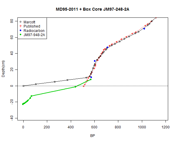 The original authors dated the 10.5 cm of MD95-2011 above the latest radiocarbon date to approximately 50 years, assigning the core top to 510 BP. In contrast, Marcott et al assigned the core top to 0 BP, using the same methodology as MD95-2043. This is illustrated in the age-depth comparisons shown below.