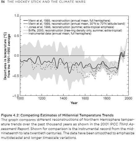 Well, that graph appears to contain Mike’s Nature Trick. I can’t confirm that personally but compare Steve McIntyre’ description here, and it sure looks like the one inside Mann’s book has the up-pointing S-wiggle). And, it appears that only Jean S has noticed the irony of that Curtis comment and link.
