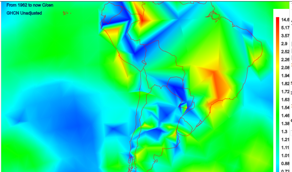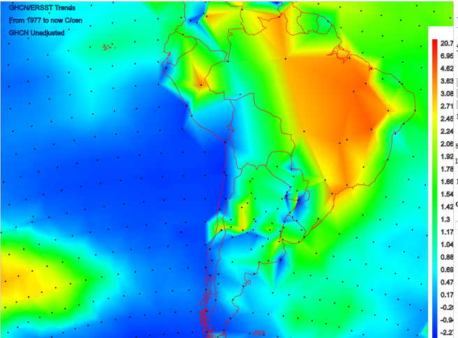 I think SST is fairly good, and that’s what’s needed here. Yes, Amazonian S Am is poorly covered in GHCN. I’ve put another shot here, this time of last 25 years, and with stations dotted. There has been strong SE Pacific SST cooling over that shorter period.