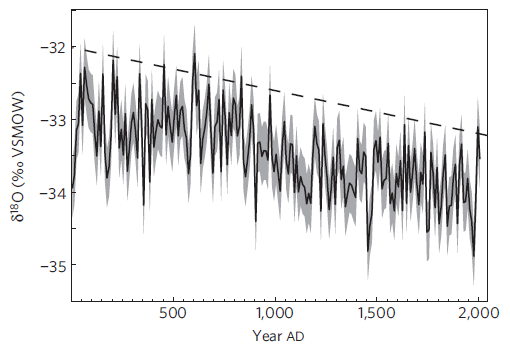 2. The abstract says, “However, δ18O anomalies comparable to those of recent decades occur about 1% of the time over the past 2,000 years.” This appears to be only in relation to the declining δ18O trendline. Would it be correct to say that if compared to the mean δ18O of the past 2,000 years, the anomalies of recent decades would actually still be negative in comparison to the mean?