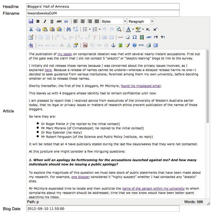 In today’s post, I want to discuss Lewandowsky’s backdating of the blogpost in which he purported to “out” four skeptics, a claim that he re-iterated and embellished in a subsequent academic article, Lewandowsky et al (Fury). In response to a recent FOI request by Simon Turnill, the University of Western Australia stated that, based on their examination of records at Lewandowsky’s blog, it had been published on Sep 10 11:50:00 Australian Western Time (CLICK):