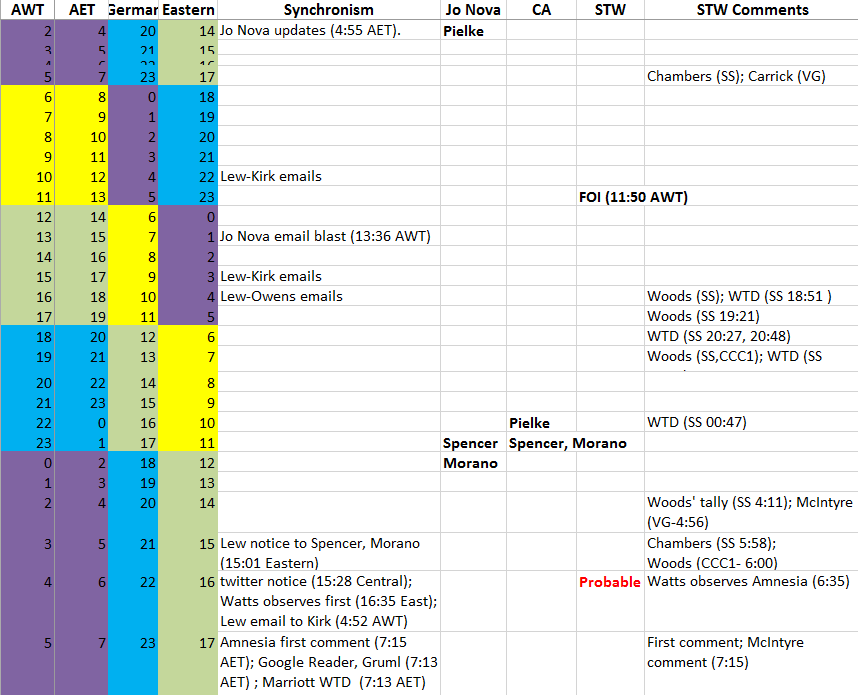 Here is a summary of the timeline for Sep 10, with each of the relevant timezones color coded on the left. Attempts to impute an earlier time to Lewandowsky’s post are particularly constrained by the multiple documented visits to STW without encountering the post, his notice letter to Morano and Spencer, plus the timing of the tweet, the GRUML feed, the first comment and other responses once the post had been published. (CLICK TO ENLARGE)