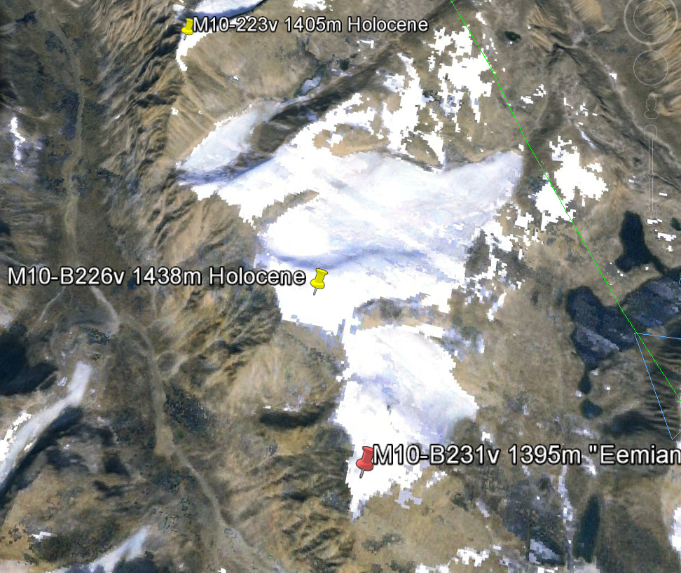 “How does one reconcile the supposed in situ continuity of the little “ice cap” in the vicinity of sample M10-B231v (1395 m) since 44000 BP with recession in the vicinity of nearby higher M10-B226v (1438 m)?”