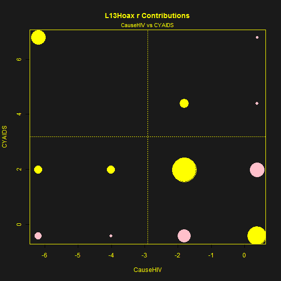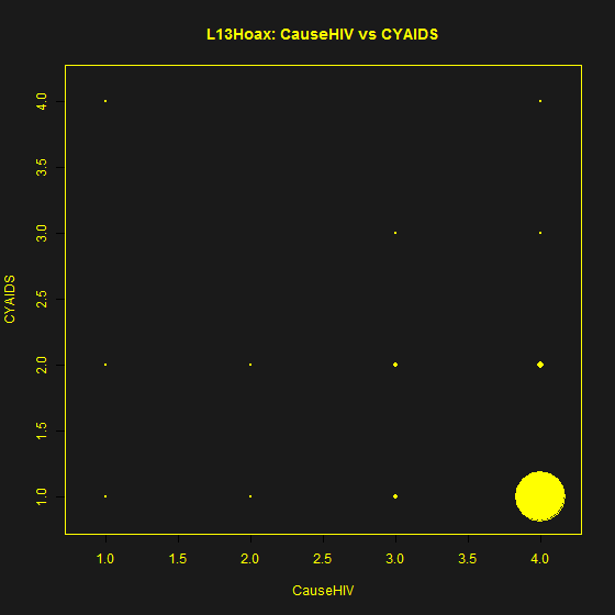 The contingency table of CauseHIV and CYAIDS for the L13Hoax data is shown below, with the size of each circle proportional to the count in the contingency table. Most of the responses are identical – thus the large circle. Because there are only two respondents purporting to hold the two most unlikely views, this is a very faint dot. A correlation coefficient implies a linear fit and normality of residuals: visually this is obviously not the case. There are a variety of tests that could be applied and the supposed Lewandowsky correlation will fail all of them.