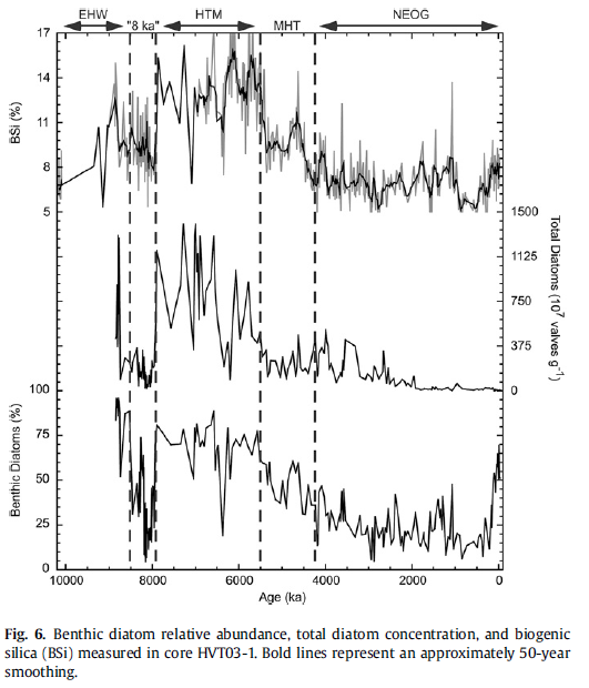 During the Holocene Thermal Maximum (HTM), the recession of the glacier meant that sediments were not varved. Miller et al utilized biogenic silica and information on diatoms to reconstruct HTM warmth, as shown below.