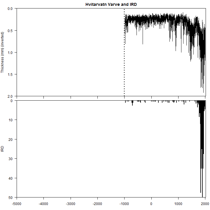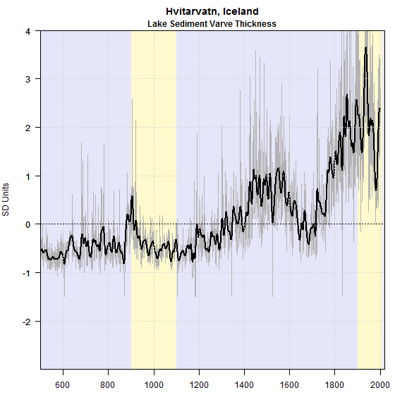 In a previous post on PAGES2K Arctic, I pointed out that they had used the Hvitarvatn, Iceland series (PAGES2K version shown below), upside-down to the interpretation of the original authors (Miller et al), who had interpreted thick varves as evidence of the Little Ice Age. A few days ago, Miller and coauthors archived a variety of series from Hvitarvatn, prompting me to review this data.
