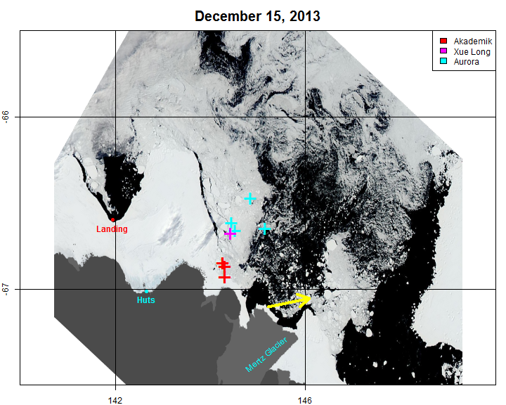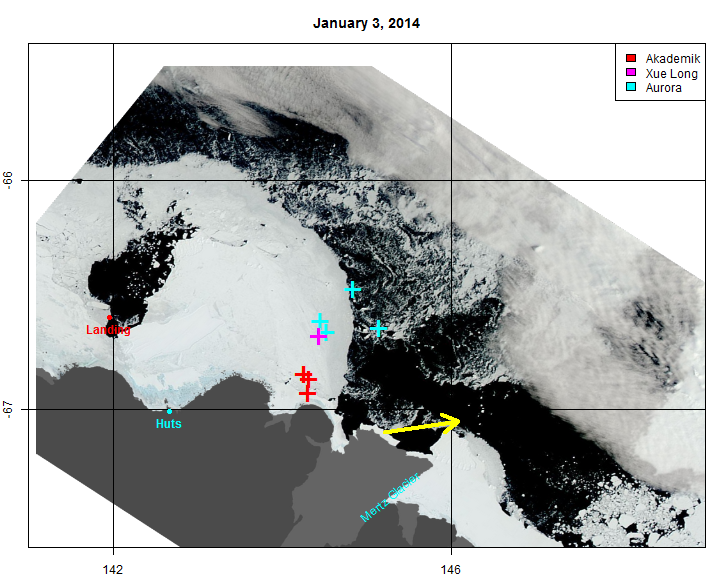 By January 2, the Aurora Australis icebreaker (cyan +) had broken through enough pack ice to get close to the Xue Long. On January 2, the helicopter from the Xue Long evacuated passengers from the Ship of Fools to an ice floe near the Aurora Australis, from which they boarded the Aurora Australis. The Aurora Australis then proceeded to open waters, leaving the Xue Long and Akademik Shokalskiy still pinned. The polyna’s ice floes were now packed against the west shore of the polyna.
