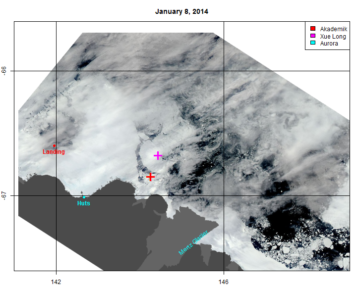 Five days after the passengers were evacuated, the sea ice underwent another re-arrangement. On January 7, a large north-south crack in the sea ice developed (see January 8 image below) and the Akademik Shokalskiy and Xue Long both picked their way out of the pack ice into the polynya (stuck positions shown below). Ironically, the passengers would have arrived back in New Zealand sooner, had they stayed on the vessel rather than evacuating, though there was, of course, no way that this could have been predicted at the time of evacuation.
