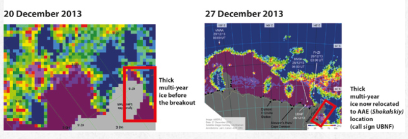 The leader of the expedition, Chris Turney (also a secondary Climategate correspondent and co-signer of Lewandowsky’s multisignatory letter in the Conversation), claimed that the incident could not have been predicted. He said that they were trapped by a sudden “breakout” of multi-year ice (“fast ice”) that had previously been part of the ice shelf and that there was no way that they could have anticipated this. Turney’s claim has been uncritically accepted by the climate community e.g. Turner of the British Antarctica Survey here.