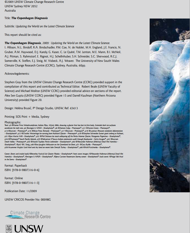 The surprising answer is that the copyright to The Copenhagen Diagnosis is the sub-charterer of the Ship of Fools: the University of New South Wales (click on image at left for enlargement of the frontispiece). Out of all the universities and institutions in the world, why the University of New South Wales? Dunno.