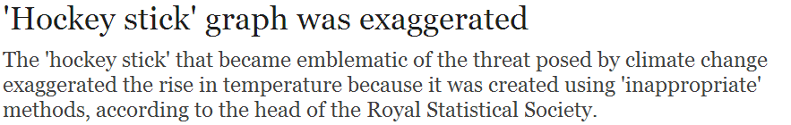 Louise Gray of the Daily Telegraph, generally highly sympathetic to green causes, reported that Hand had accused Mann of using “inappropriate” methods that had “exaggerated” the threat from climate change, an accusation emblazoned in the article’s headline: