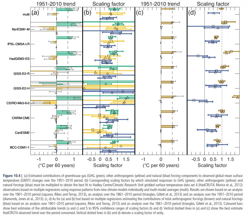 Figure 10.4 of AR5, reproduced as Figure 2 below, shows in panel (b) estimated scaling factors for three forcing components: natural (blue bars), GHG (green bars) and ‘other anthropogenic’ – largely aerosols, ozone and land use change (yellow bars). The bars show 5–95% confidence intervals from separate studies based on 1861–2010, 1901–2010 and 1951–2010 periods. Best estimates from the studies using those three periods are shown respectively by triangles, squares and diamonds. Previous research (Gillett et al, 2012)[v] has shown that scaling factors based on a 1901 start date are more sensitive to end date than those starting in the middle of the 19th century, with temperatures in the first two decades of the 20th century having been anomalously low, so the 1861–2010 estimates are probably more reliable than the 1901–2010 ones.