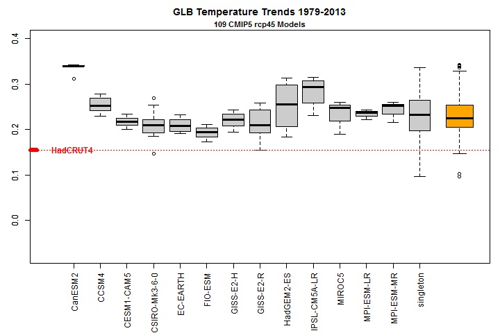 Temperature trends in °C/decade. Virtually all model climates warmed much faster than the real climate over the last 35 years. Source: https://climateaudit.org/2013/09/24/two-minutes-to-midnight/. Models with multiple runs have separate boxplots; models with single runs are grouped together in the boxplot marked ‘singleton’. The orange boxplot at the right combines all model runs together. The default settings in the R boxplot function have been used; the end of the boxes represent the 25th and 75th percentiles. The red dotted line shows the actual trend in global surface temperature over the same period per the HadCRUT4 observational dataset. The 1979–2013 observed global temperature trends from the three datasets used in AR5 are very similar; the HadCRUT4 trend shown is the middle of the three.