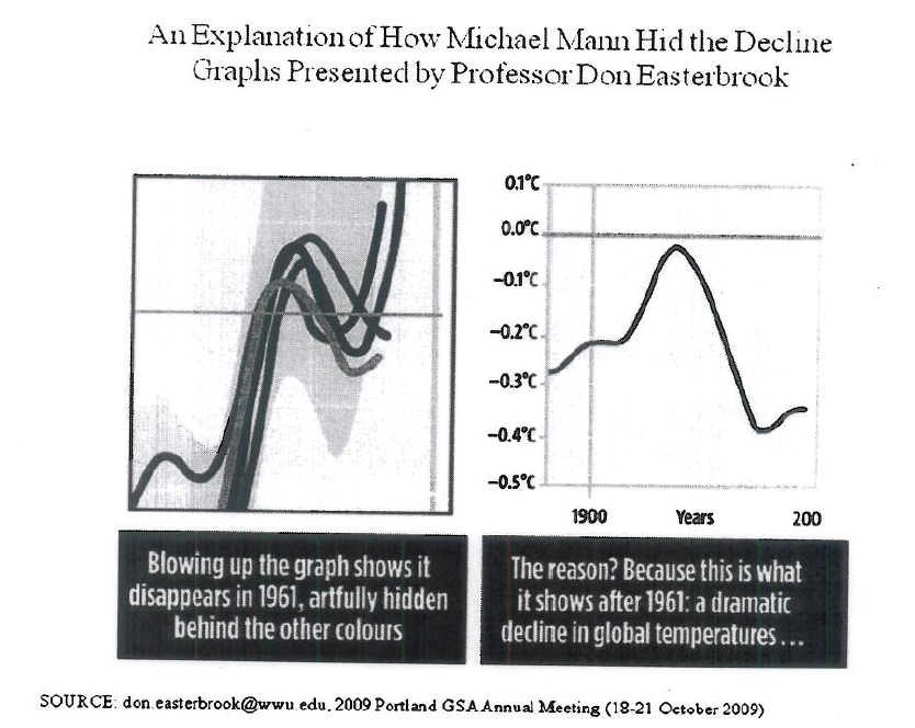 At the October 2009 annual meeting of the Geological Society of America, Professor Don Easterbrook demonstrated how tree ring data from Russia, which show a cooling after 1961, were artfully truncated in graphs presented in IPCC publications. (See attachment at p 12.) This truncation gave the false impression that the tree ring data agree with reported late 20th century surface temperature data, when in fact they did not. This artful deceit, now exposed, indicates that the IPCC Assessment Report 4 (AR4) is scientifically questionable. The CRU emails leaked in November confirmed that this deception was deliberate. …