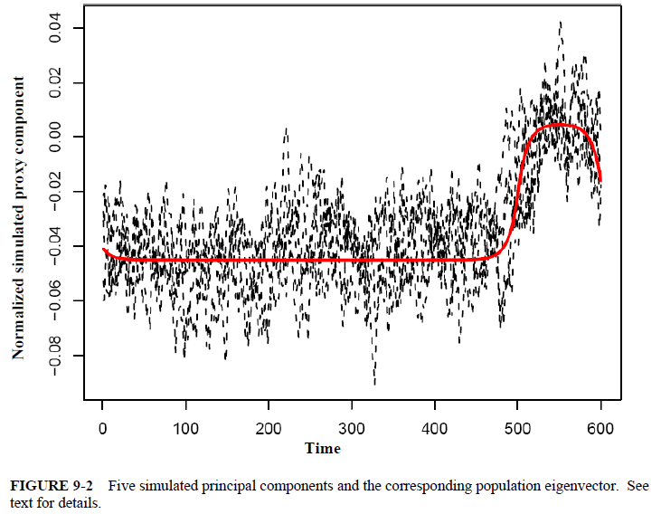 The figure [Figure 9-2] shows the first components from five such simulations overlaid. Principal components have an arbitrary sign, which was chosen here to make the last 100 values higher on average than the remainder.