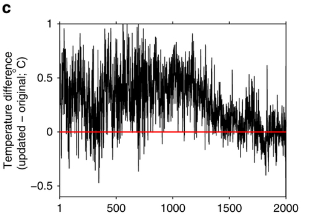 Jean S: “Graph C” is the difference between PAGES2k original (2013) and the newly updated arctic reconstruction. My plot has the PAGES2k original and the Kaufman et al (2009) (corrected) reconstruction.