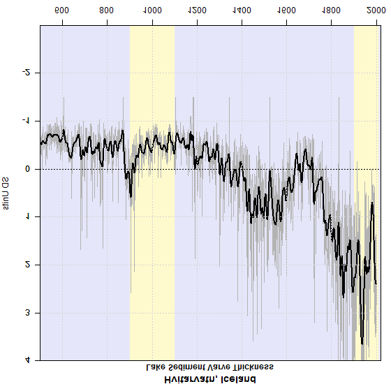 This confirmation of my interpretation is of considerable interest to me, since there seems to be a close relationship between the Iceland varve series and Baffin Island varve series, a location of considerable interest from a multiproxy perspective, as discussed in a previous post here, where I showed the close relationship between the Hvitarvatn, Iceland varve thickness series and the Big Round Lake, Baffin Island varve thickness as below. PAGES2K is in the awkward position of orienting the Hvitarvatn in an opposite orientation to their orientation of Big Round Lake, though the two series are evidently responding similarly. It is surely unacceptable for assessment-quality studies to leave such inconsistencies unresolved.