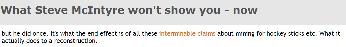 “[..]Steve by suggesting that he has been vocal about decentered PCA causing perturbations in PC1, but quiet about his own demonstration that the end effect did not add hockey sticks to the reconstruction.[..]”