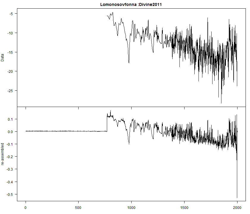 In this last figure, I’ve calculated a weighted average of the underlying proxies, weighted by the number of measurements, and compared the resulting reconstruction to the precalibrated paico reconstruction. The correspondence is extremely high, other than at the very end, where the population of proxies drops sharply, apparently leading to odd effects.