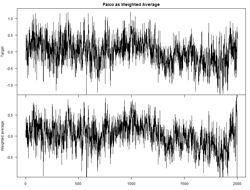In today’s post, Jean S and I are going to show that the paico reconstruction, as implemented in the present algorithm, is very closely approximated by a weighted average of the proxies, in which the weights are proportional to the number of measurements. Paico is a methodology introduced in Hanhijarvi et al 2013 (pdf here) and applied in PAGES2K (2013). It was discussed in several previous CA posts.