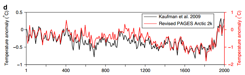Figure 1. McKay and Kaufman 2014 Figure 2d showing – on inconsistent scale – revised PAGES Arctic 2K (red) and Kaufman 2009 (black).