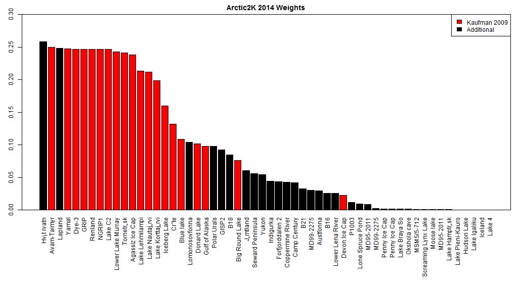 The barplot in Figure 1 below shows the effective weight of each proxy calculated using this methodology (with the weights standardized so the sum of squares is equal to 1). Proxies previously used in Kaufman et al 2009 shown in red and other proxies in black.