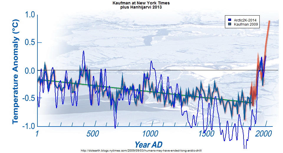 Figure 2. Comparison of revised PAGES Arctic 2K (blue) and Kaufman 2009 (black), overplotting onto New York Times figure.