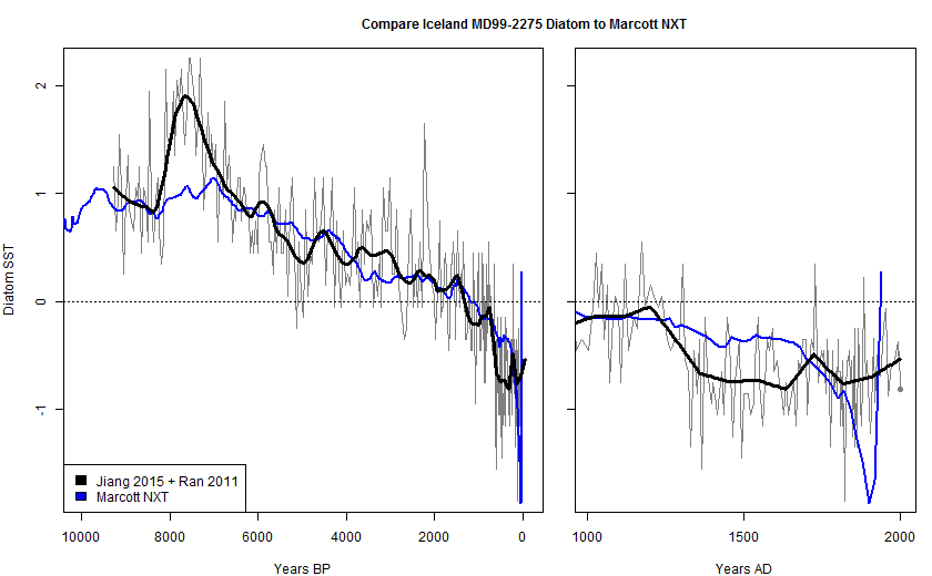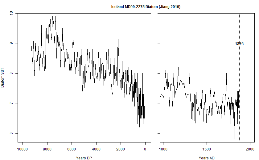 The MD99-2275 core offshore Iceland is a very high-resolution ocean sediment core, results of which over the past millennium have been discussed here from time to time. Alkenone and diatom results for the last millennium have been available for about 10 years. MD99-2275 results were used in PAGES2K Arctic and Hanhijarvi 2013, also Trouet et al 2009, but not Marcott et al 2013. Because of their high resolution and because of their extension through box cores into the 20th century, it’s gratifying that high resolution results are now becoming available through the Holocene. In 2012, alkenone results were extended back at high resolution to 4500 BP and last week, Jiang et al archived their diatom results back to 9271 BP in the early Holocene. In today’s post, I’ll show the new results from Jiang et al and show an interesting comparison to Marcott.