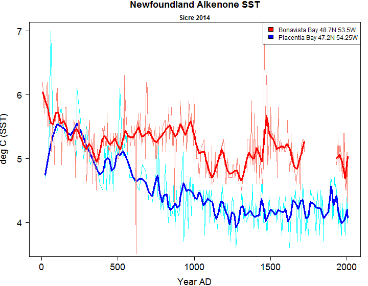 Steve: if global warming causes both warmer and cooler SSTs, almost anything can be rationalized ex post. At face value, I presume that you agree that neither the Iceland alkenone SST data nor the Newfoundland alkenone SST supports a Hockey Stick. No doubt you have ex post rationalizations, but on this simple point, it would be helpful if you clarify your agreement on this simple point so we can see whether there are any points of agreement to build on.