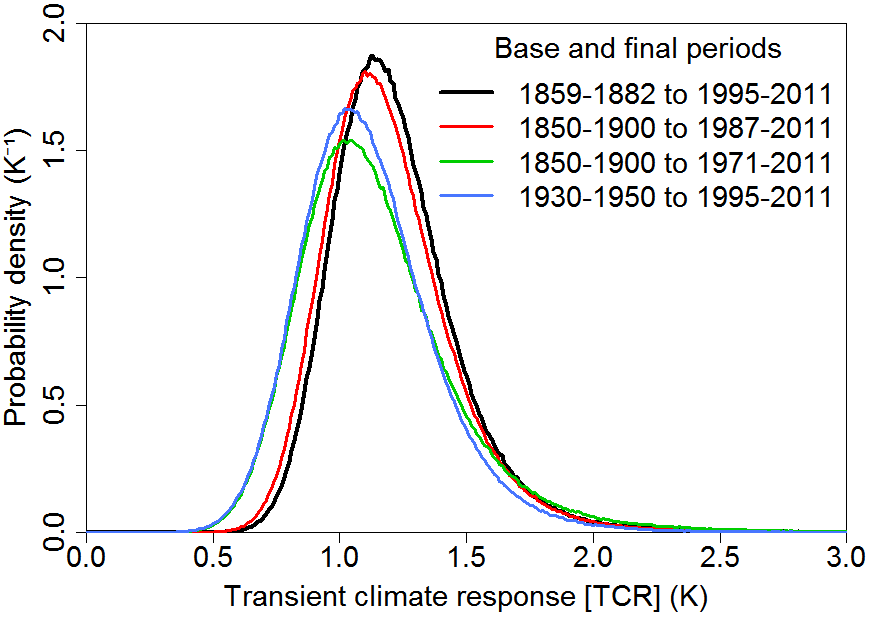 The new ECS and TCR estimates, and the uncertainty associated with them, can also be presented in the form of probability density functions, as in Figures 1 and 2. The PDFs are skewed due principally to the dominant uncertainty, that in forcing, affecting the denominator of the fractions used to estimate ECS and TCR.