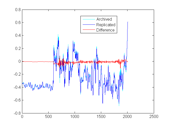 In the next figure, I’ve plotted both the pseudo-AMOC index using Mann et al 2009 gridded data (thick blue), shown for the 500-2006 period included in the archive, and the corresponding pseudo-AMOC index using the Mann et al 2008 NH reconstruction as in the previous figure (shown as thin blue). Either way, there is a dramatic step change in the pseudo-AMOC reconstruction at AD900, with values prior to AD900 being comparable to the supposedly alarming late 20th century values. .Perhaps Rahmstorf’s decision not to show values prior to AD900 has an innocent and unrelated explanation, but unfortunately Rahmstorf and coauthors did not provide it.