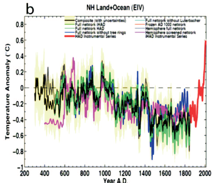For the Northern Hemisphere mean, Mann et al. [12 – 2008] produced reconstructions using two different methods, composite-plus-scale (CPS) and errors in variables (EIV). Here we use the land-and-ocean reconstruction with the EIV method using all the available proxies, which is the reconstruction for which the best validation results were achieved