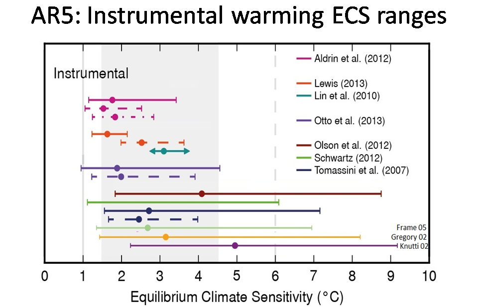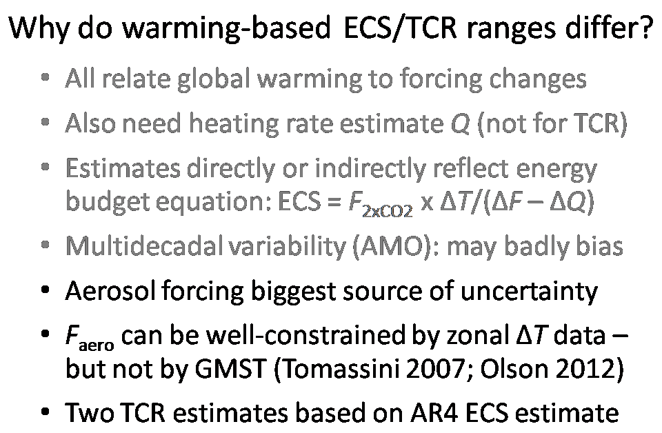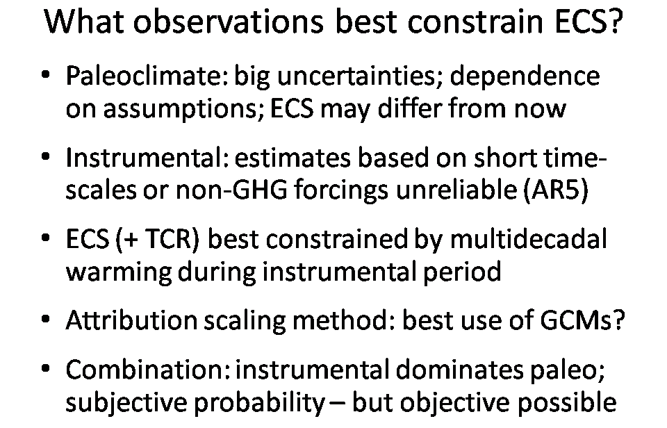 The first three bullet points of Slide 3 reiterate what the IPCC fifth assessment WG1 report (AR5) said in Chapters 10 and 12 about palaeoclimate ECS estimates and those based on short timescales or non-greenhouse gas (GHG) forcings, and its implicit conclusion that estimates based on multidecadal warming during the instrumental period (since about 1850) were likely to prove most reliable and provide the narrowest uncertainty bounds.